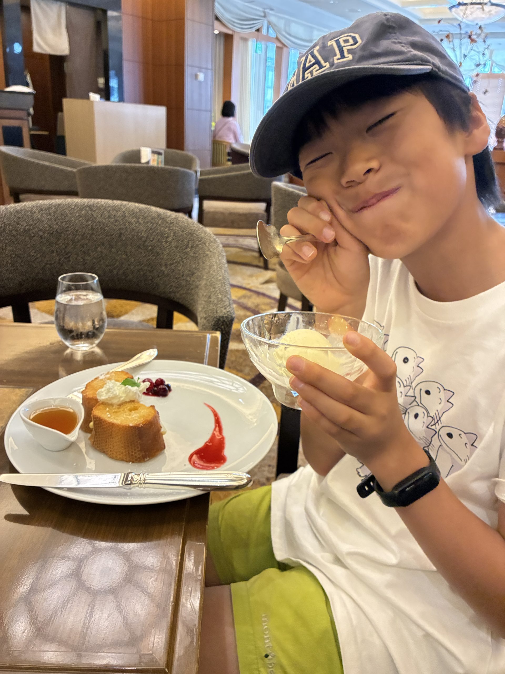 試合で頑張ったご褒美に、ちょっと美味しいものが食べたいとのことでルミエールでのティータイム。美味しいフレンチトーストとアイスで幸せいっぱいのお顔です。また活躍したらここに連れてきてね!とのリクエストをもらい、頑張った時のご褒美に使わせてもらっています。グランヴィアホテルの特別感がとっても嬉しいようです。ゆったりとした空間で美味しいものをいただいて、本当にいい時間を過ごせる場所です。
