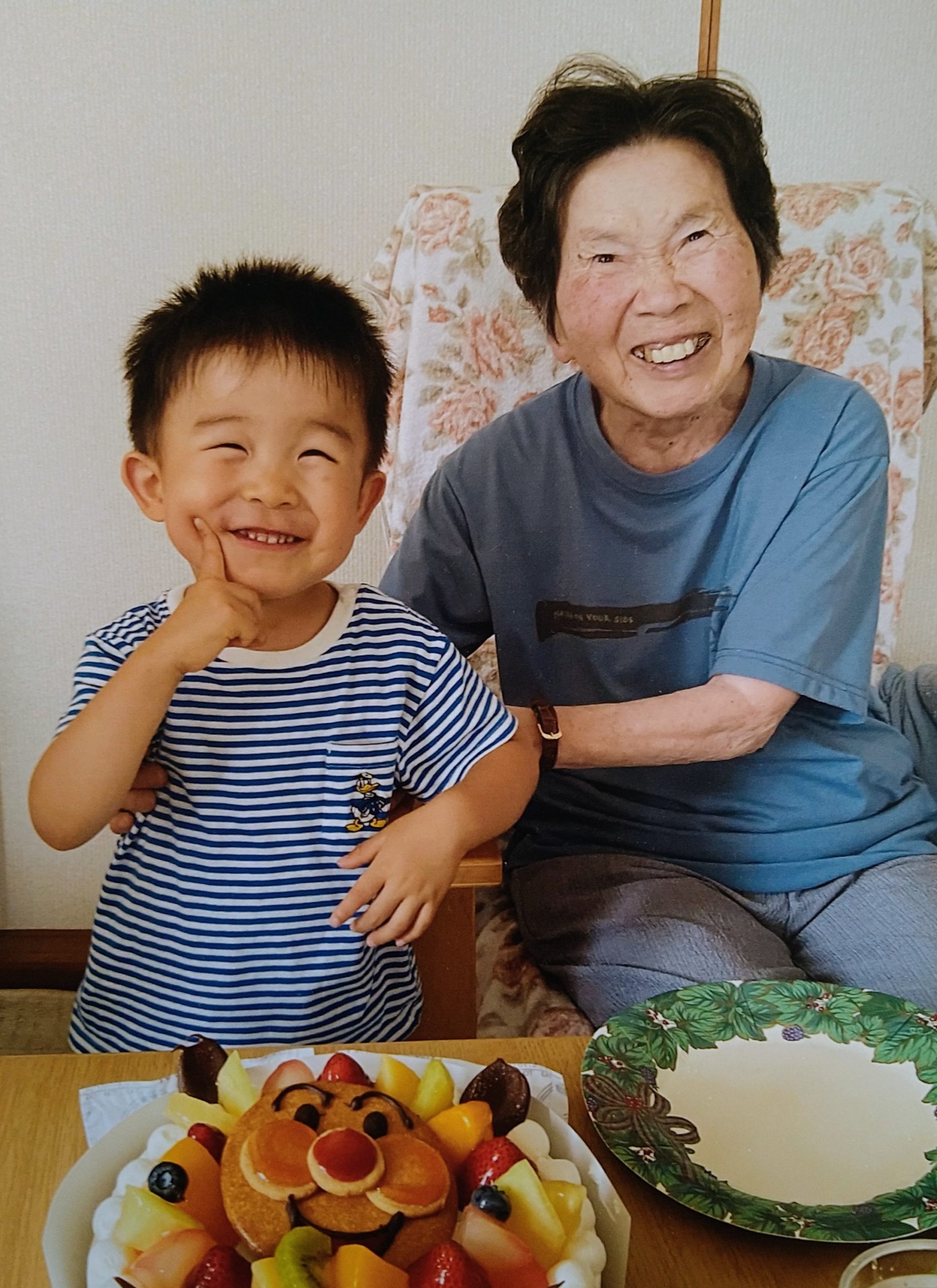 妹が産まれる時に母さんが産院に入院して寂しくなったので、岡山の大きいばあちゃん家に遊びに来ました。最初は元気がなかったけれどアンパンマンのケーキを見たらこんな笑顔になりました。