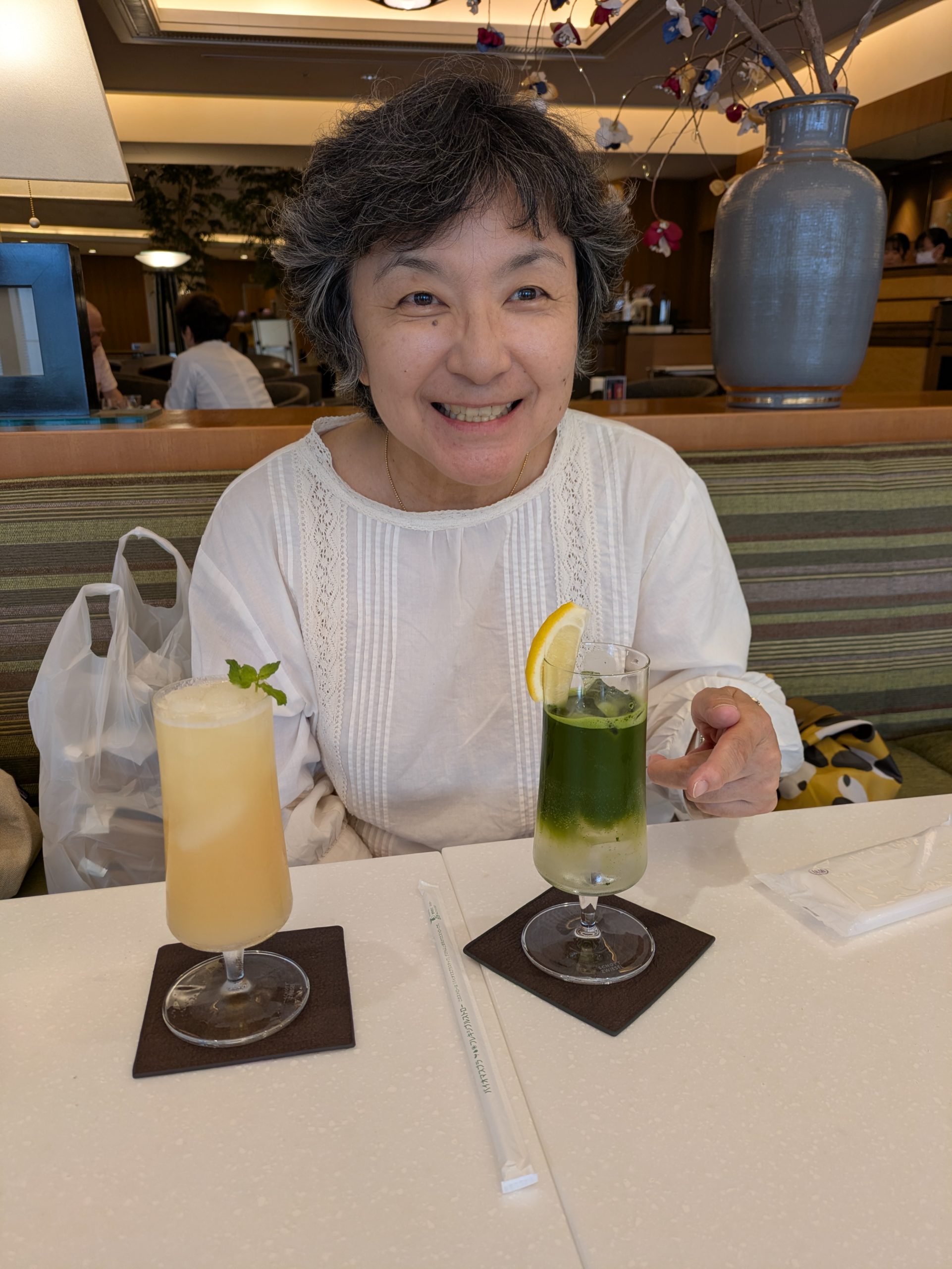 岡山が初めての妹を連れてきました。フル―ツ王国らしく、桃のドリンクと、抹茶と瀬戸内レモンのコラボドリンク初めてでした😊