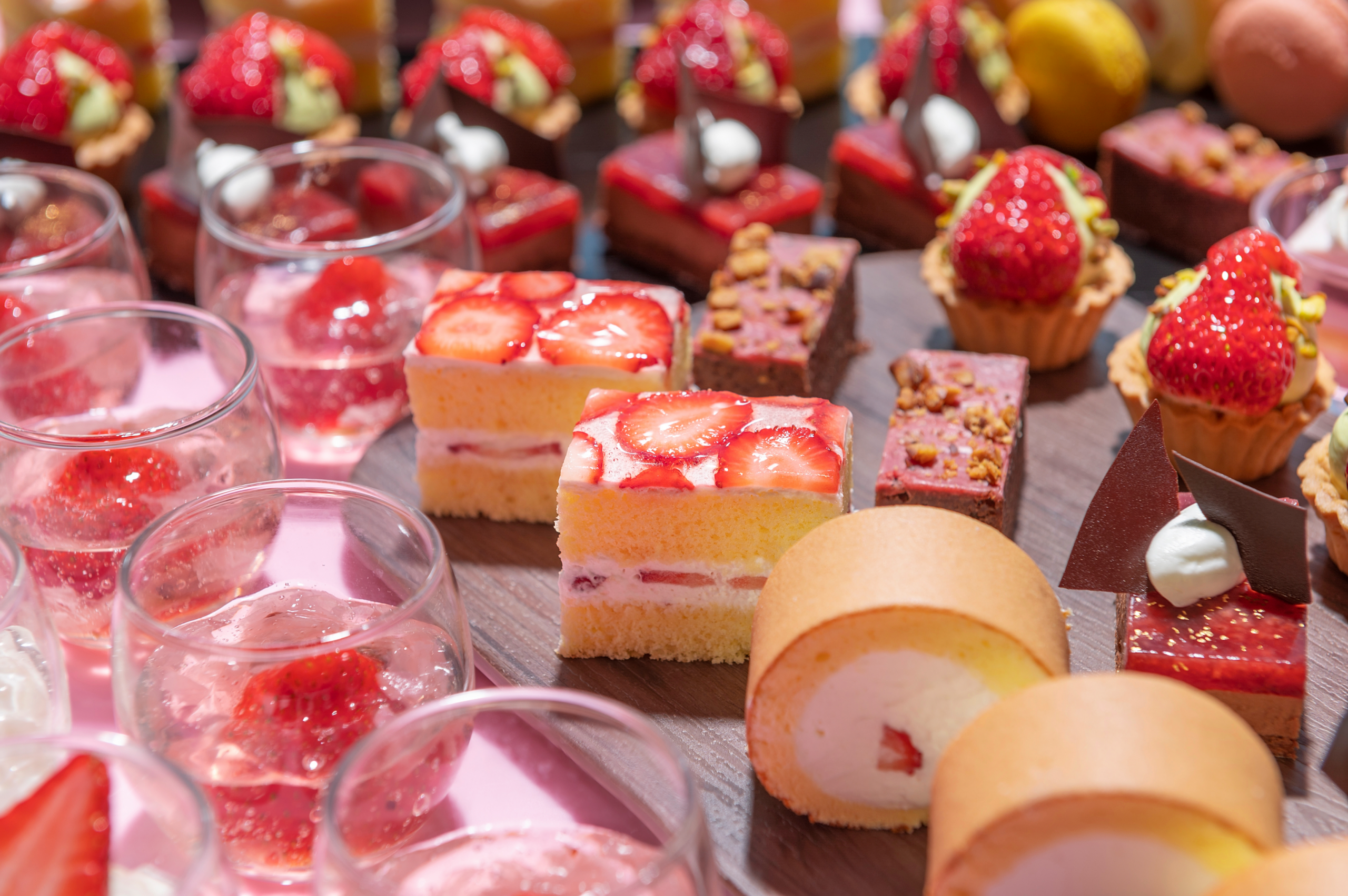 ホテル最上階のスカイビューが広がる空間に、数々の苺スイーツが華やかに並ぶ圧巻のブッフェ台。