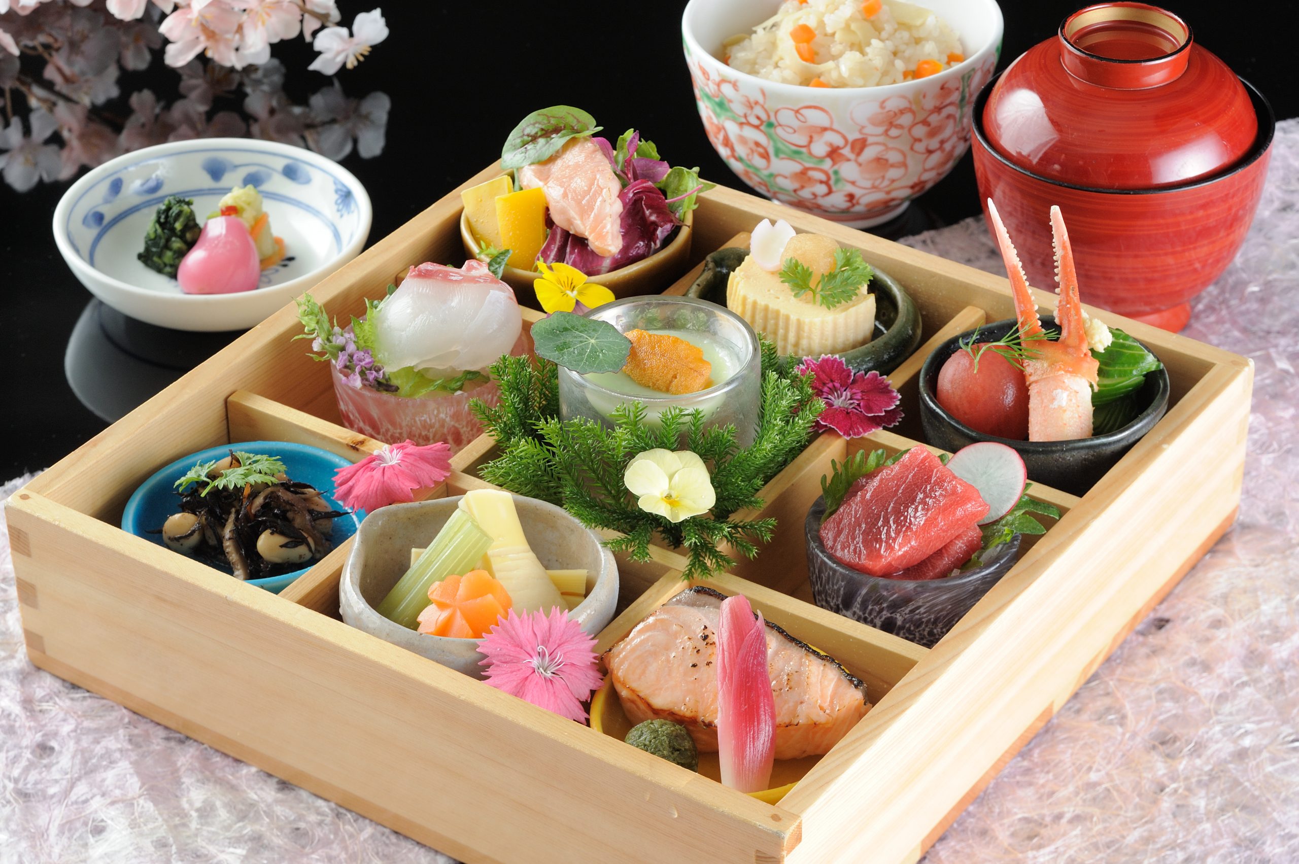 色とりどりの料理を小鉢にあしらえ、格子の木箱に、目にも華やかに仕立てました。
