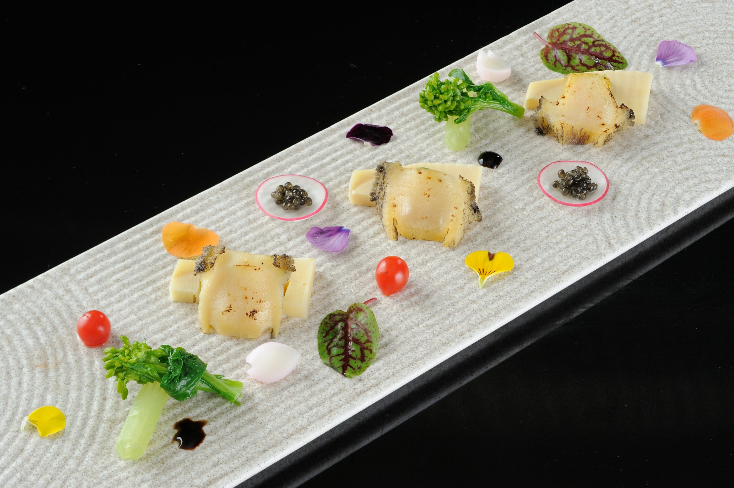 姫鮑の旨みに筍の軽やかな食感、キャビアの繊細な塩味を添えた先付。