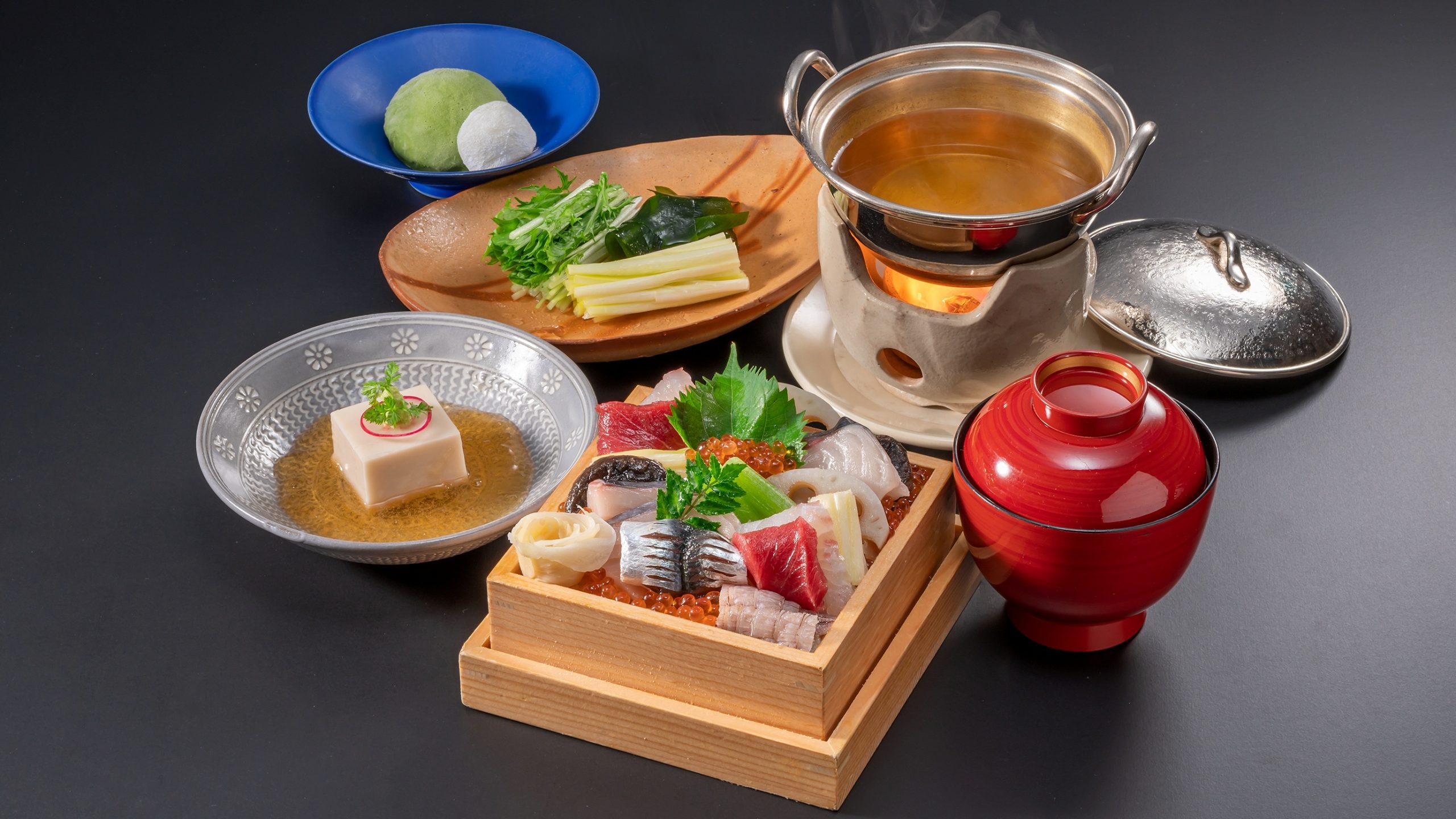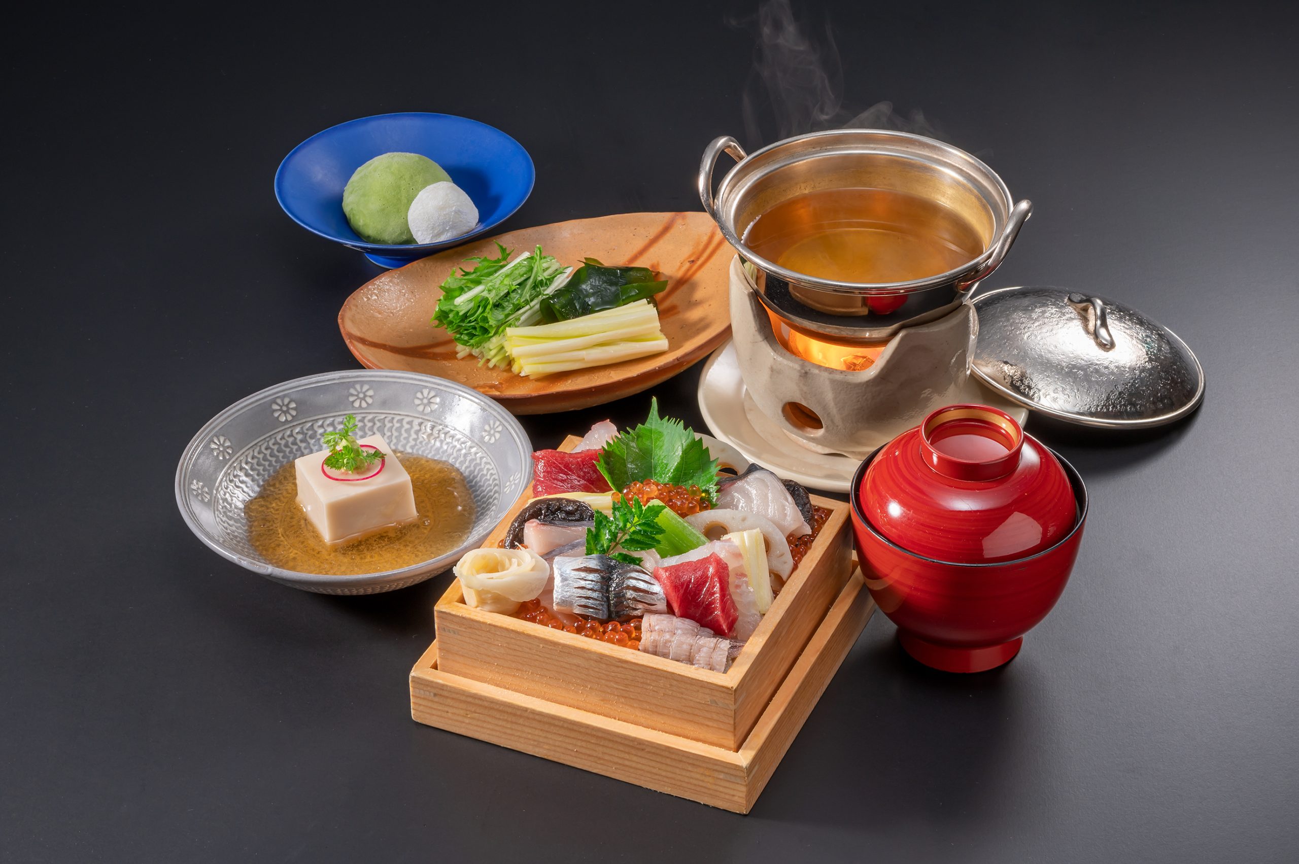 大名家のおもてなし料理の「湯やっこ・鯛うしほ・鴨茶碗蒸・空豆羹」と、江戸時代備前藩主・池田光政の倹約令によって生まれた岡山のちらし寿司を吉備膳独自にアレンジしてご用意しました。岡山県を代表する郷土料理のばら寿司は開けてのお楽しみです。