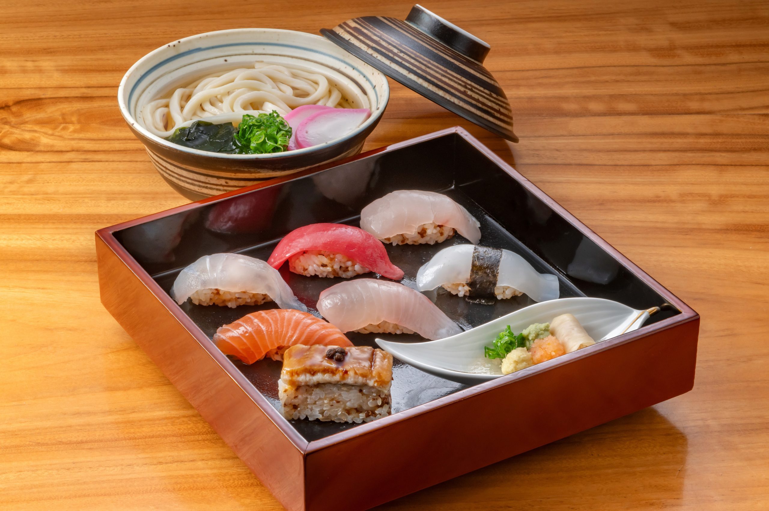 彩り豊かな握り寿司七種盛りに、讃岐うどんまたは茶碗蒸しを添えた寿司御膳。