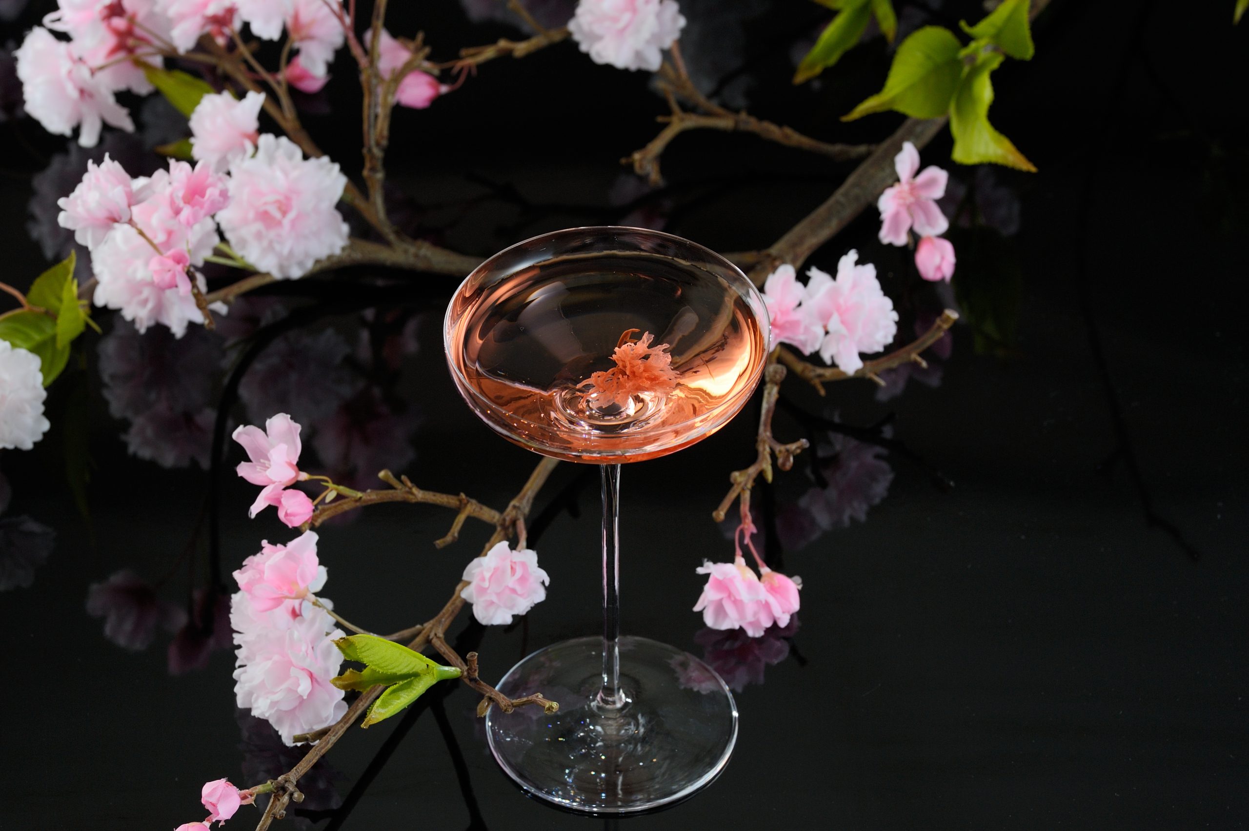 桜の花びらが静かに浮かび、夜桜を思わせる見た目にも美しい一杯。
