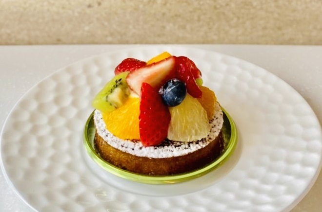 アーモンドとバターの香り高いタルトに季節のフルーツを盛り合わせた見た目も楽しいケーキ。