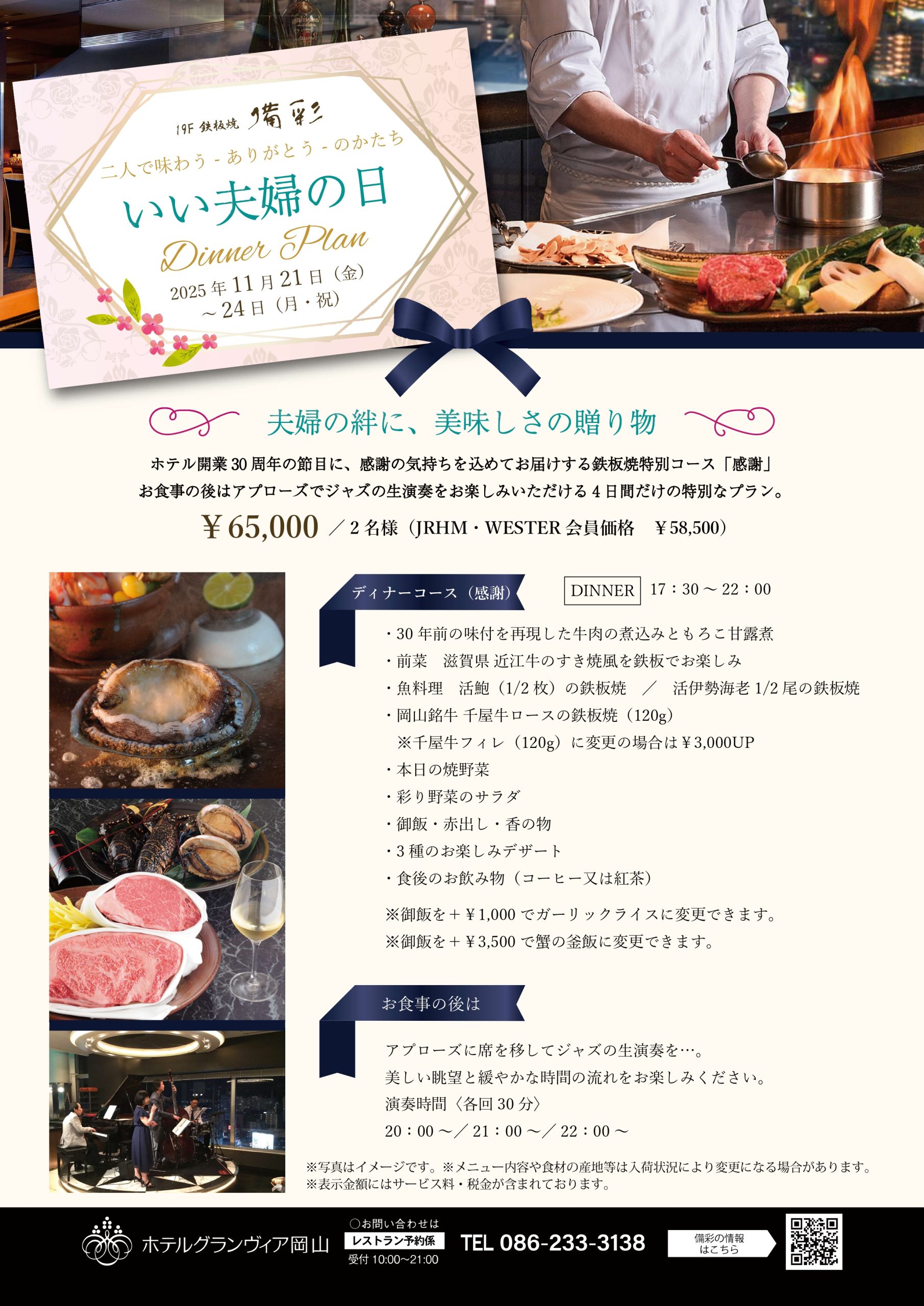 | 料金 | ¥65,000 /2名様 (JRHM・WESTER会員価格 ¥58,500) |