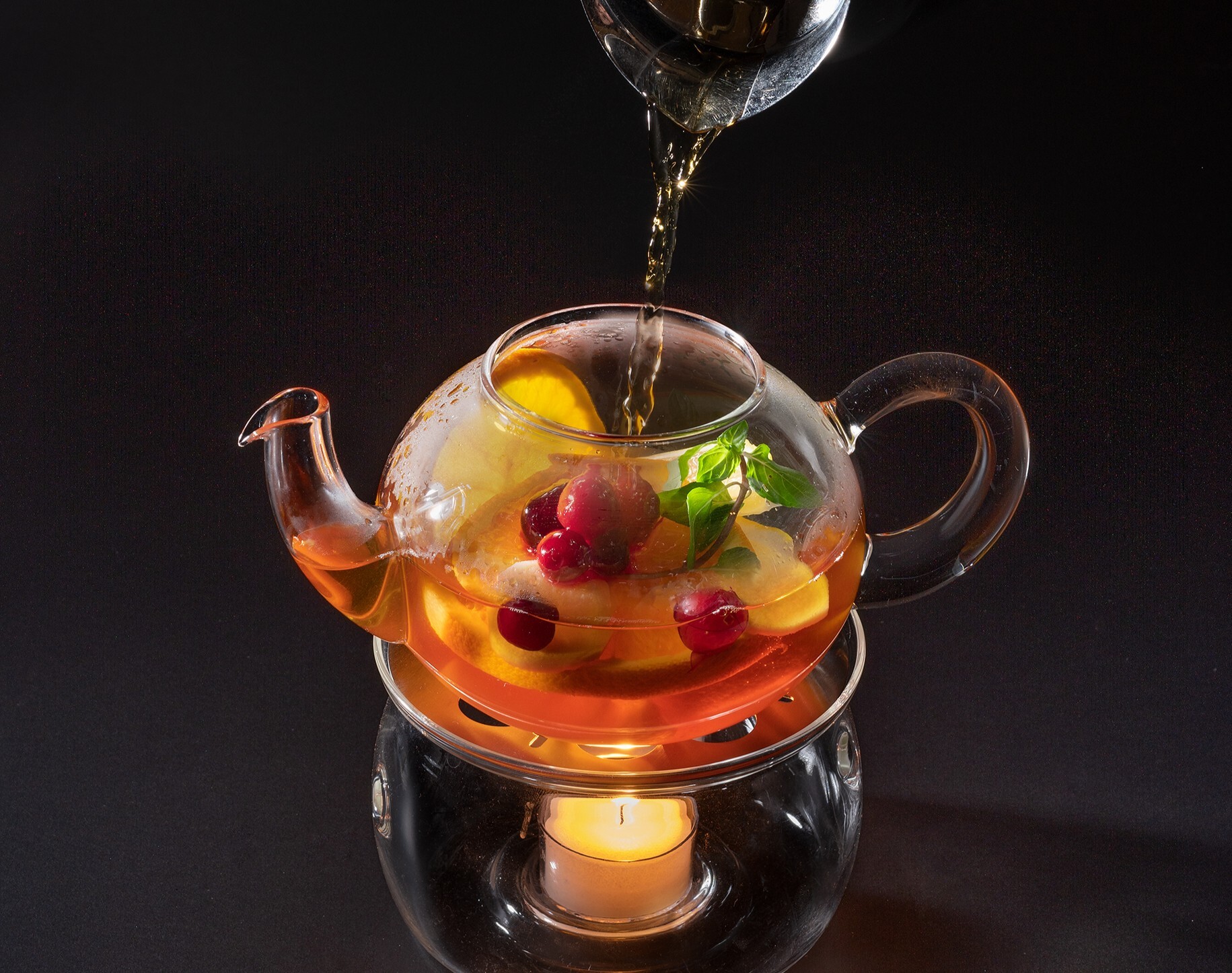 柑橘系フルーツ、ベリー、生姜、ミントにりんごの優しい風味とジンジャーのスパイシーな味わいのロンネフェルト「スイートジンジャーティー」を注いだフルーツティー。