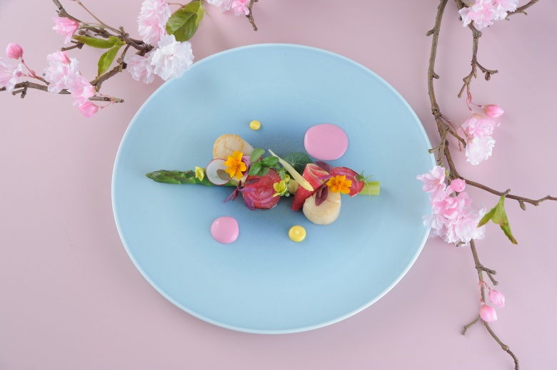 ビーツとオランデーズのソースで春を描いた前菜。
